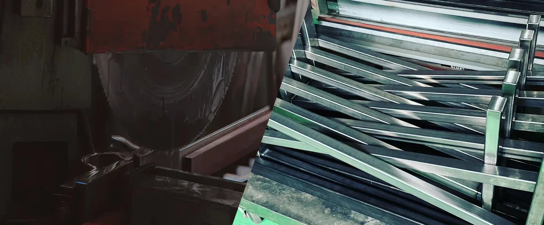 土肥板金工業株式会社の社名看板、ステンレス天板の仕上げ、建築現場向けのステンレス長尺金物、工場内で製作中の大型什器フレームをまとめた写真。