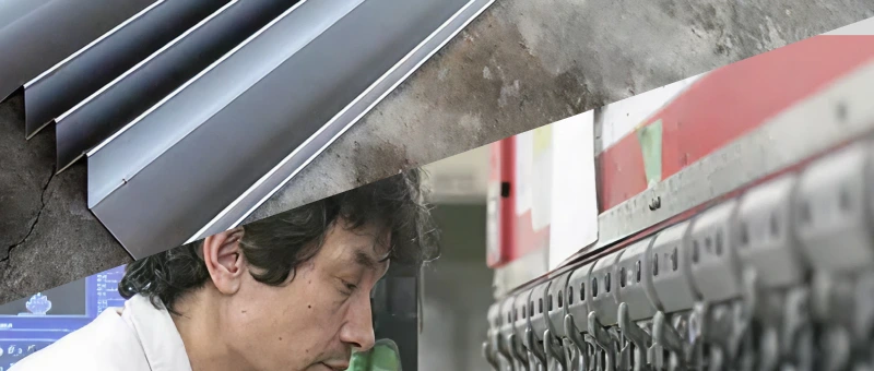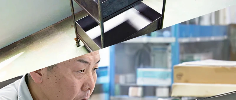 工場内で金属部品を持って歩く板金職人の後ろ姿。作業場で金物製作が進む様子。