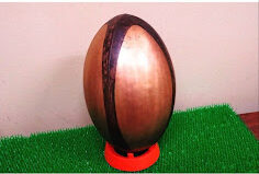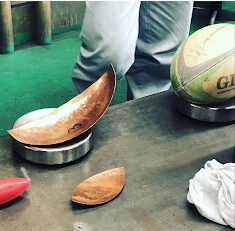 金属の板から、ラグビーボール特有の美しい曲線と膨らみを再現した、弊社を代表する創作事例です。最大のポイントは、機械プレスではなく「手作業による叩き出し(しぼり加工)」でこの立体感を生み出している点にあります。平面の板を叩き、伸ばし、縮める工程を繰り返すことで、有機的なフォルムを追求しました。